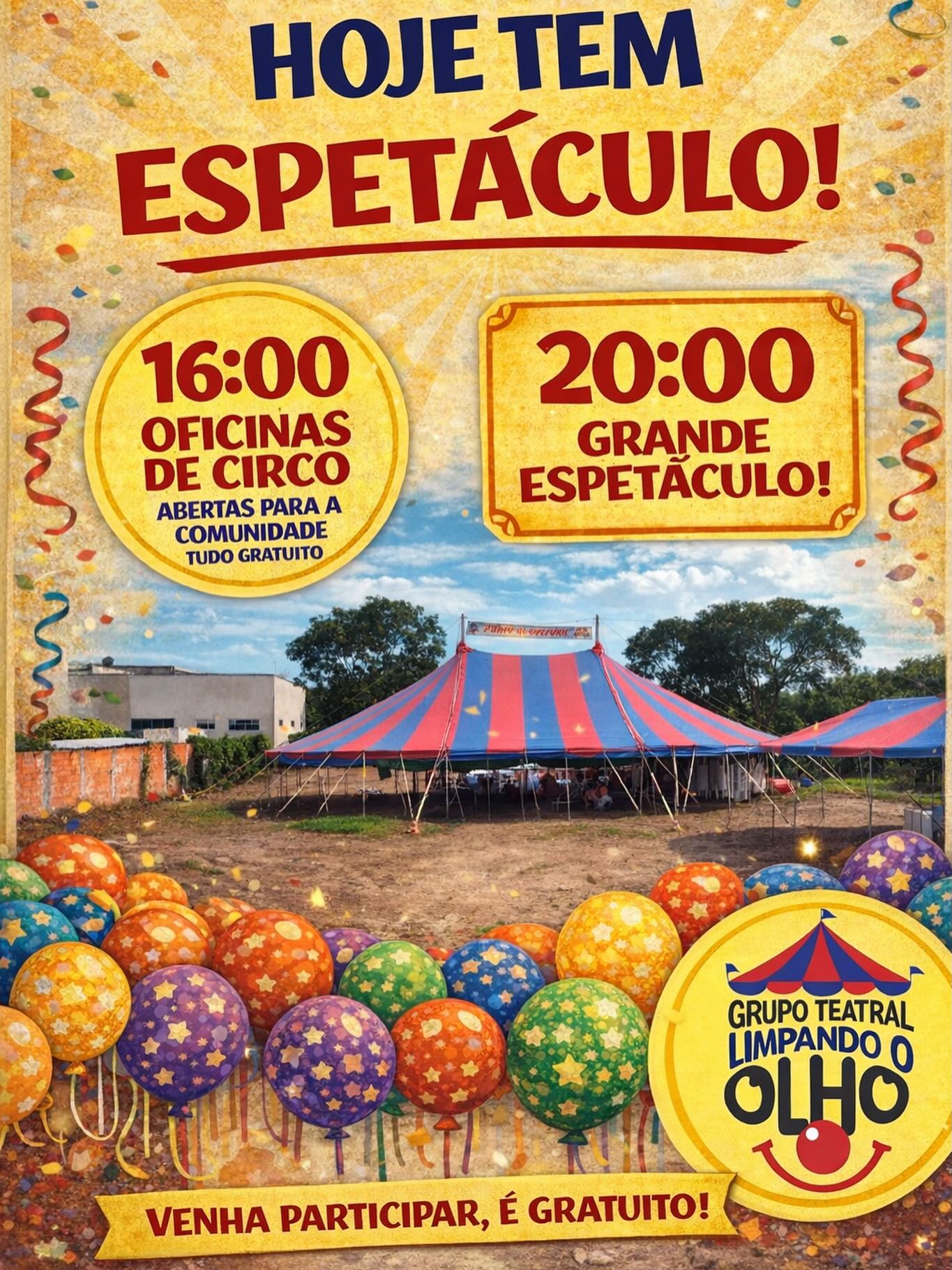 Se liga na agenda circense: 16h: Oficinas de circo abertas para toda a comunidade. Vivências, aprendizado e muita diversão! 20h: Grande espetáculo! Apareça, viva essa experiência com a equipe e os parceiros do Grupo Teatral Limpando o Olho (GTLO). Chame sua família, os amigos e ocupe esse espaço de arte, alegria e encontro! O circo é de todos. O circo é da comunidade! – Imagem: Divulgação/GTL