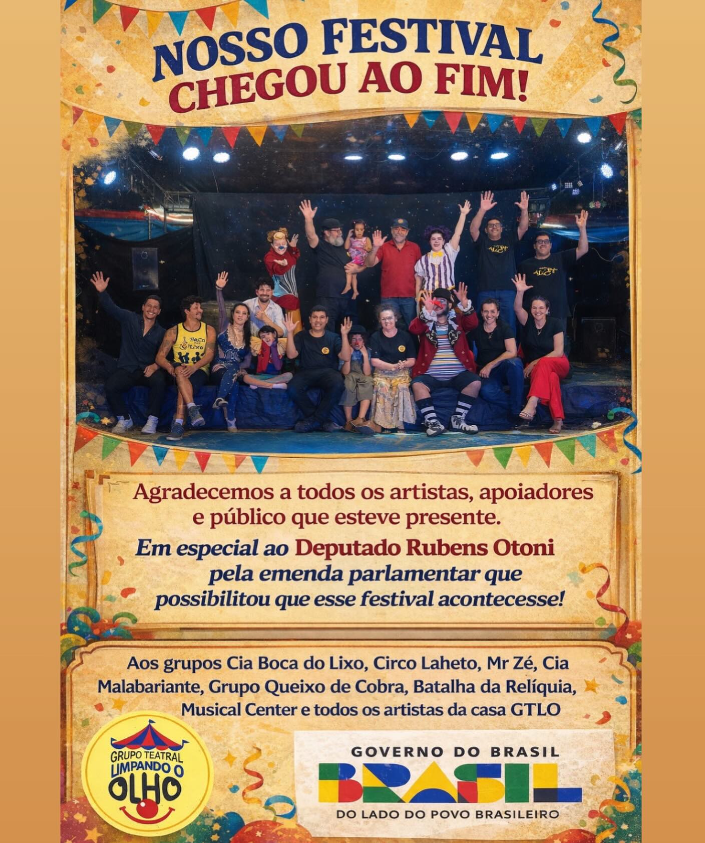 Nosso Festival chegou ao fim… E o coração tá como? Transbordando gratidão. Foram dias intensos de arte, encontros, risadas, troca e muita magia no nosso II Festival de Circo GTLO. Cada aplauso, cada olhar encantado e cada artista em cena fizeram tudo valer a pena. Nosso MUITO OBRIGADO a todos os artistas, apoiadores e ao público que esteve presente com a gente nessa jornada linda! Um agradecimento especial ao deputado Rubens Otoni, cuja emenda parlamentar possibilitou que esse Festival acontecesse. E nosso carinho aos grupos e parceiros que somaram com a gente: Cia. Boca do Lixo, Circo Laheto, Mr Zé, Cia Malabariante, Grupo Queixo de Cobra, Batalha da Relíquia, Musical Center e todos os artistas da casa GTLO. Seguimos… Porque o circo não para.. Mais informações podem ser obtidas com um clique aqui!
