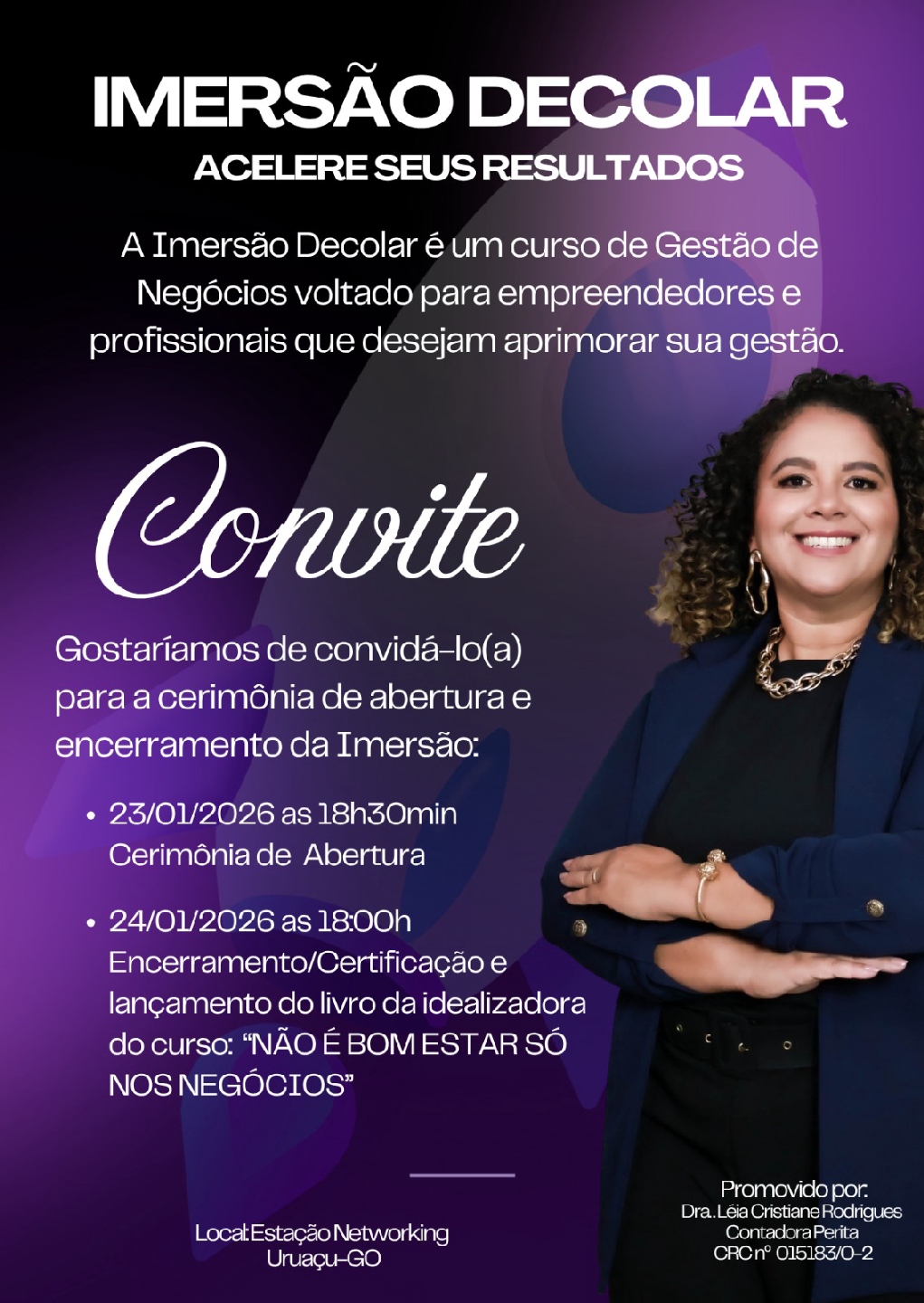 Imersão Decolar – Acelere seus resultados. Contadora perita e escritora uruaçuense, doutora Leia Cristiane Rodrigues registra convite. Curso, lançamento de livro, oportunidade em todos os sentidos. Dias 23 e 24 de janeiro, sexta e sábado, em Uruaçu. Participe!