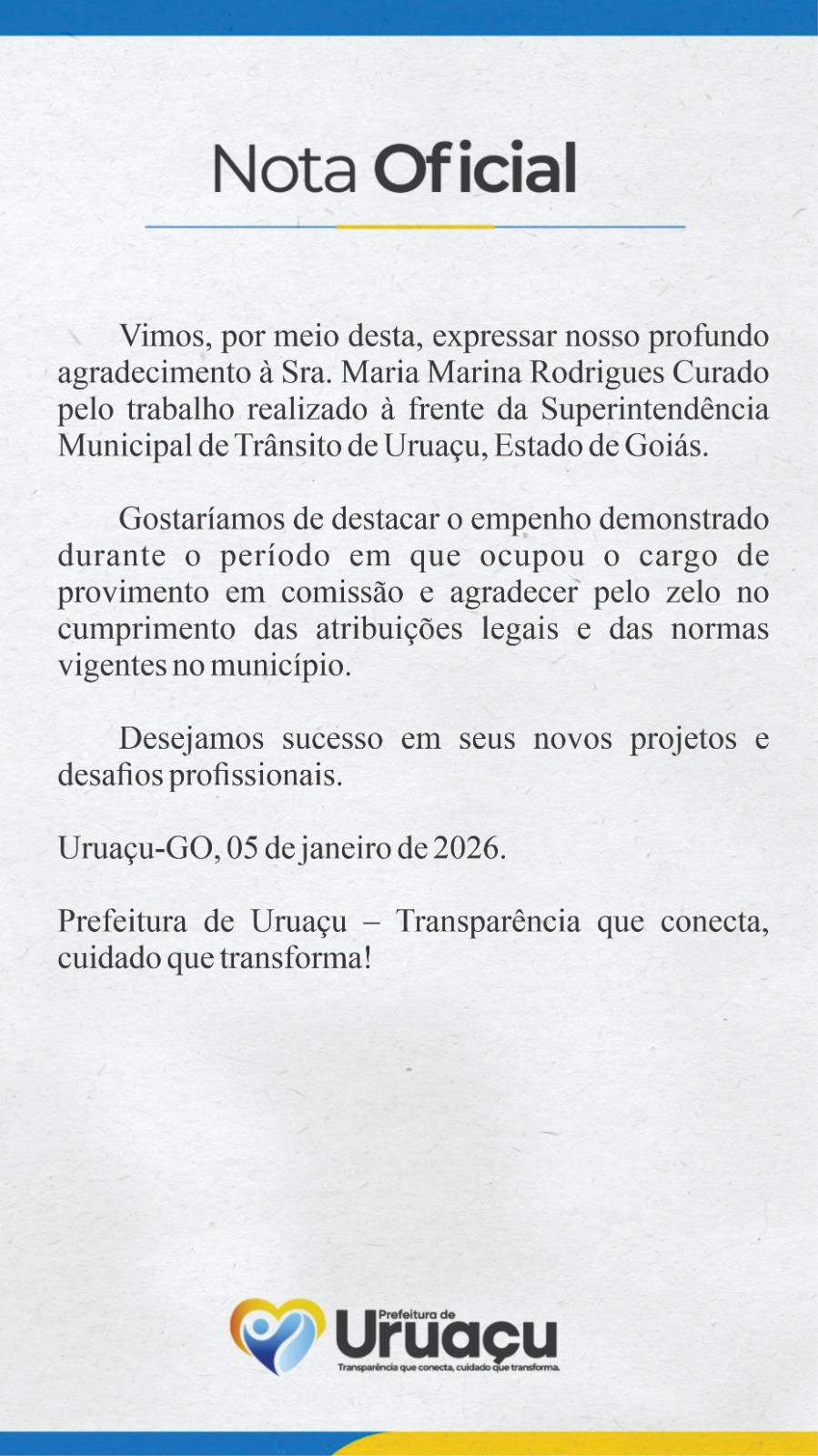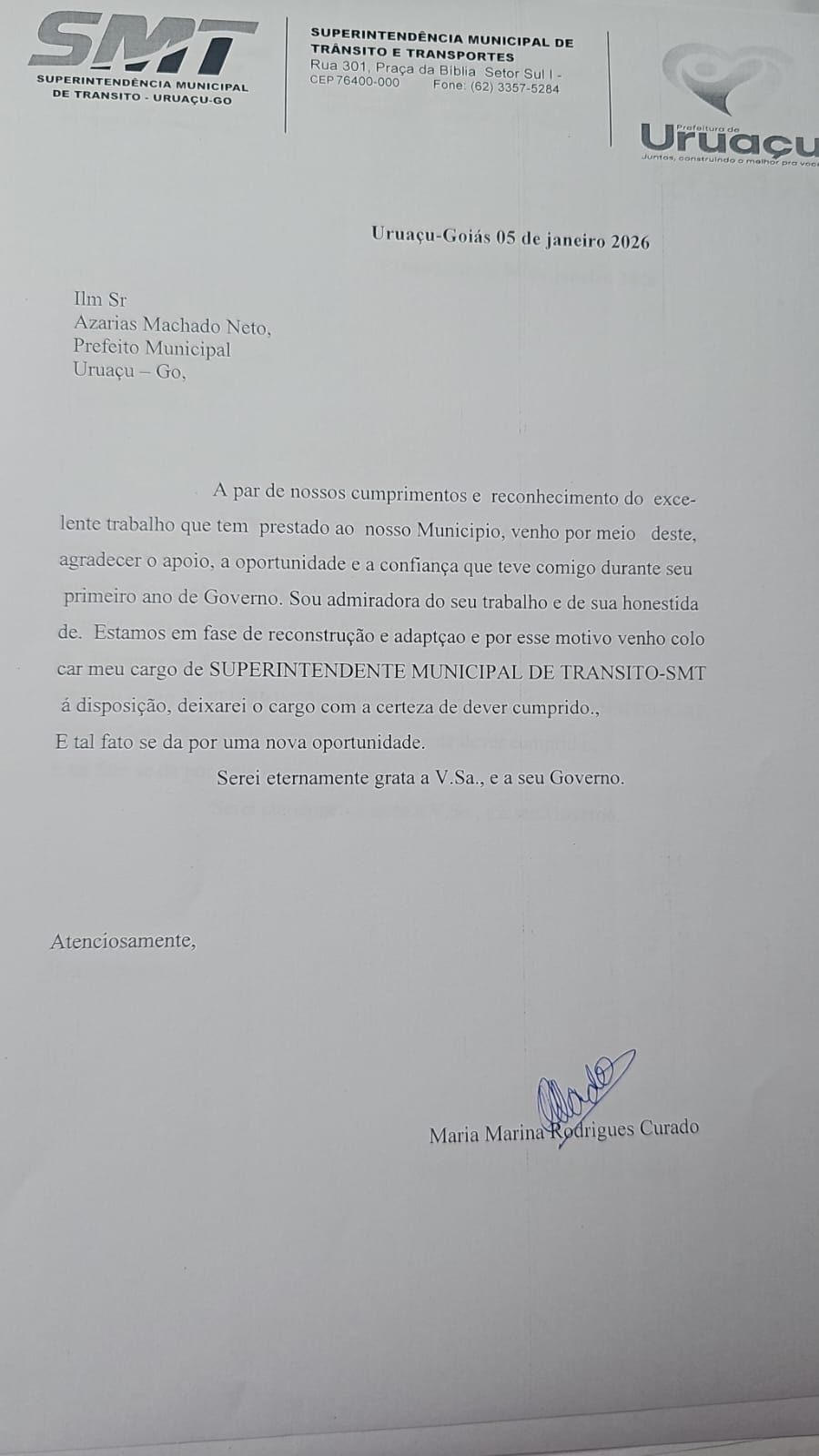 Marina Curado não é mais superintendente municipal de Trânsito em Uruaçu. Confira ‘Comunicado’ da Prefeitura e também a solicitação de exoneração dela, perante o Poder Executivo.