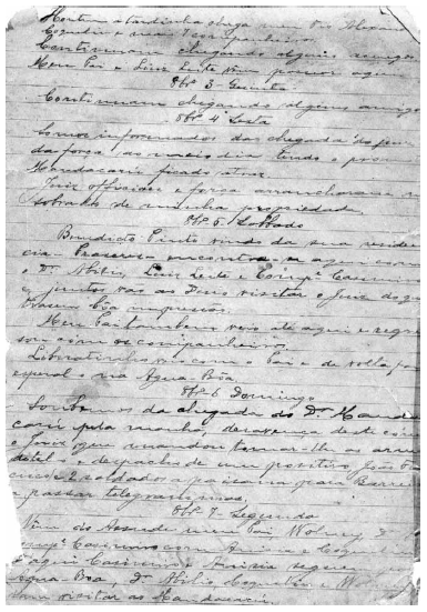 Outubro, 6 – Domingo. Soubemos da chegada do Dr. Mandacaru pela manhã, desavença deste com o Juiz, que mandou tomar-lhe as armas, detê-lo e despacho de um positivo, João Francisco e 2 soldados à paisana para Barreiras a passar telegramas.
