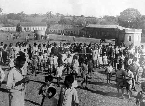 Festa do Divino no início dos anos 60, na atual praça Cel. Wolney. O Cel. Abílio Wolney – de paletó preto e cabeça baixa – está dentro do barbante que o rodeia – Fotos: livro