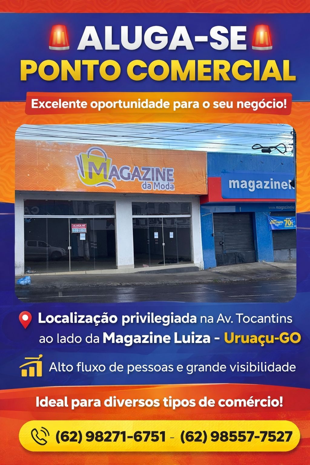 Aluga-se excelente imóvel comercial na avenida Tocantins, Centro de Uruaçu