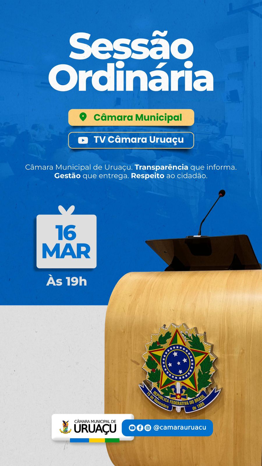 Sessão ordinária nesta segunda, 16 de março, às 19h Trabalhos parlamentares do Legislativo uruaçuense: interesse popular – Imagem: Comunicação/Câmara Municipal de Uruaçu