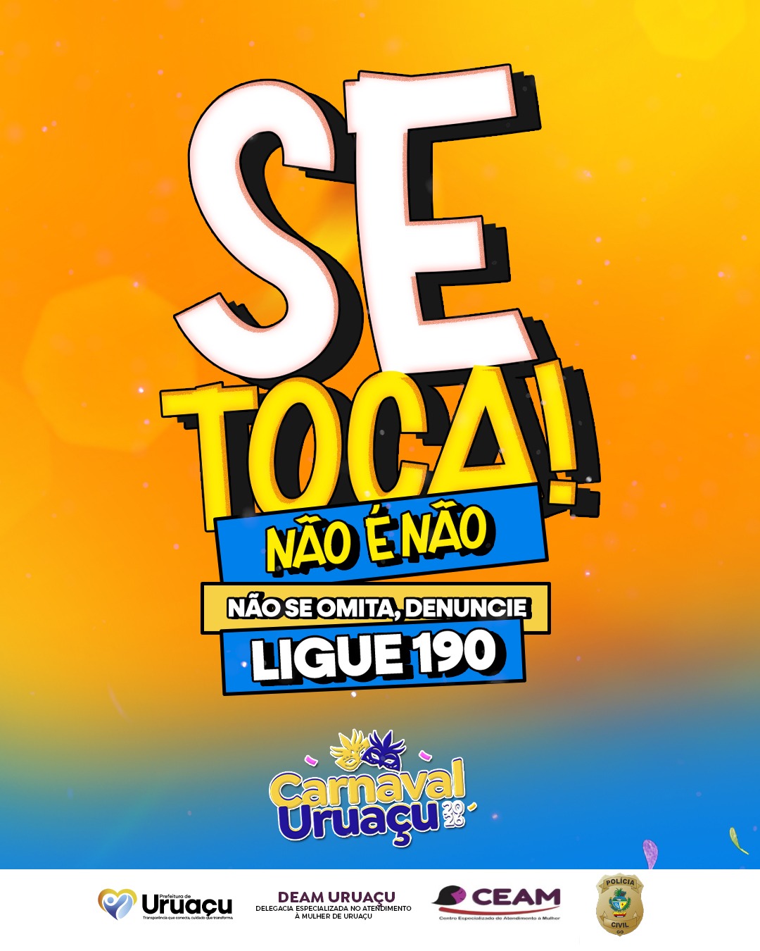 ‘Carnaval’/Uruaçu-GO – ‘Se toca! Não é não’. Não se omita, denuncie. Ligue 190! 07/02/2026 14:21:19 - atualizada há 17 horas by Jota Carnaval de Uruaçu, Norte goiano. Se toca! Não é não. Não se omita, denuncie, perante a Polícia Militar. Ligue 190!