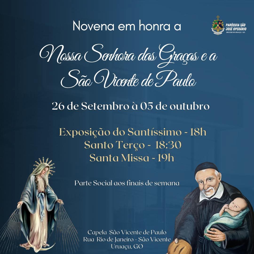 Uruaçu: a Capela São Vicente, através do Padre João Batista, convida com alegria toda a comunidade para participar da Novena em honra a Nossa Senhora das Graças e a São Vicente de Paulo, que será realizada de 26 de setembro a 5 de outubro. Programação diária: exposição do Santíssimo, 18h; Santo Terço, 18h30; e, Santa Missa, 19h. Aos finais de semana, a parte social, proporcionando momentos de convivência fraterna e partilha entre os presentes. Oportunidade para cada participante fortalecer a fé e unir em oração, com todos. Desejando que Nossa Senhora das Graças e São Vicente de Paulo intercedam junto a Deus pelas famílias e pela comunidade em geral, a organização reforça convite e pede participação máxima (Informações, sob adaptações: Comunicação).