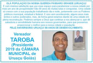 Vereador Taroba (Pros), presidente da Câmara Municipal de Uruaçu. Uruaçu 88 anos 02/07/2019 18:13:13 - atualizada há 6 anos by Jota