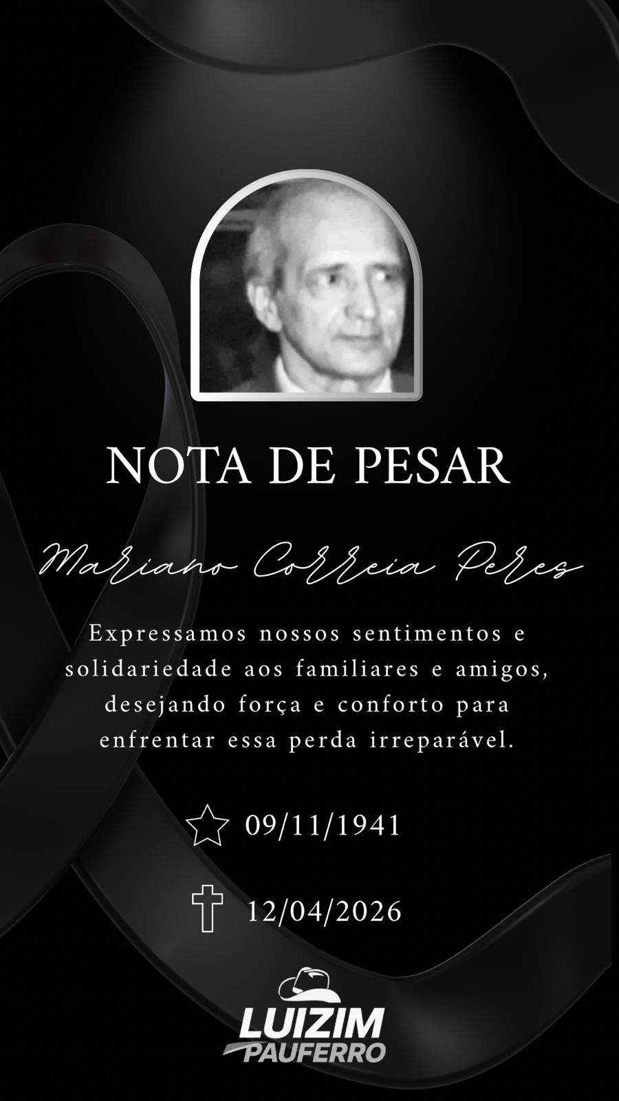 Vereador uruaçuense Luizim Pauferro (PSD) registra pesar pelo falecimento de doutor Mariano Correia Peres, ocorrido neste domingo 12 de abril de 2026.