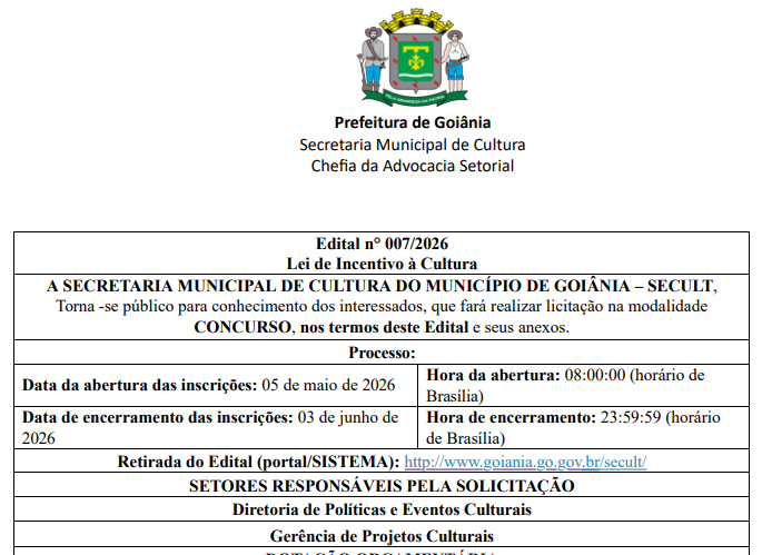 Em 2026, o Concurso de seleção de projetos culturais da Prefeitura de Goiânia contempla uma dezena de segmentos culturais.
