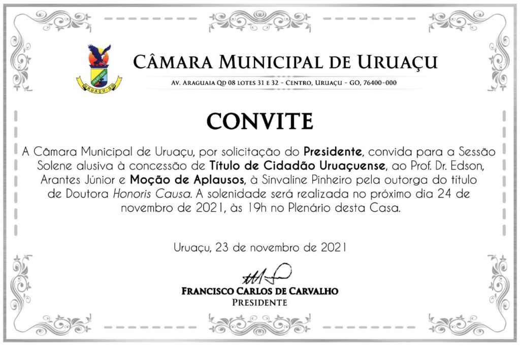 Agendada para 19h no plenário da Câmara Municipal de Uruaçu (presidida por Chiquinho, formada por outros doze parlamentares), sessão solene marcará a entrega de Título de Cidadão Uruaçuense para Edson Arantes Junior (Professor Doutor Edson), coordenador do Câmpus Norte da Universidade Estadual de Goiás (UEG) – Sede Uruaçu.