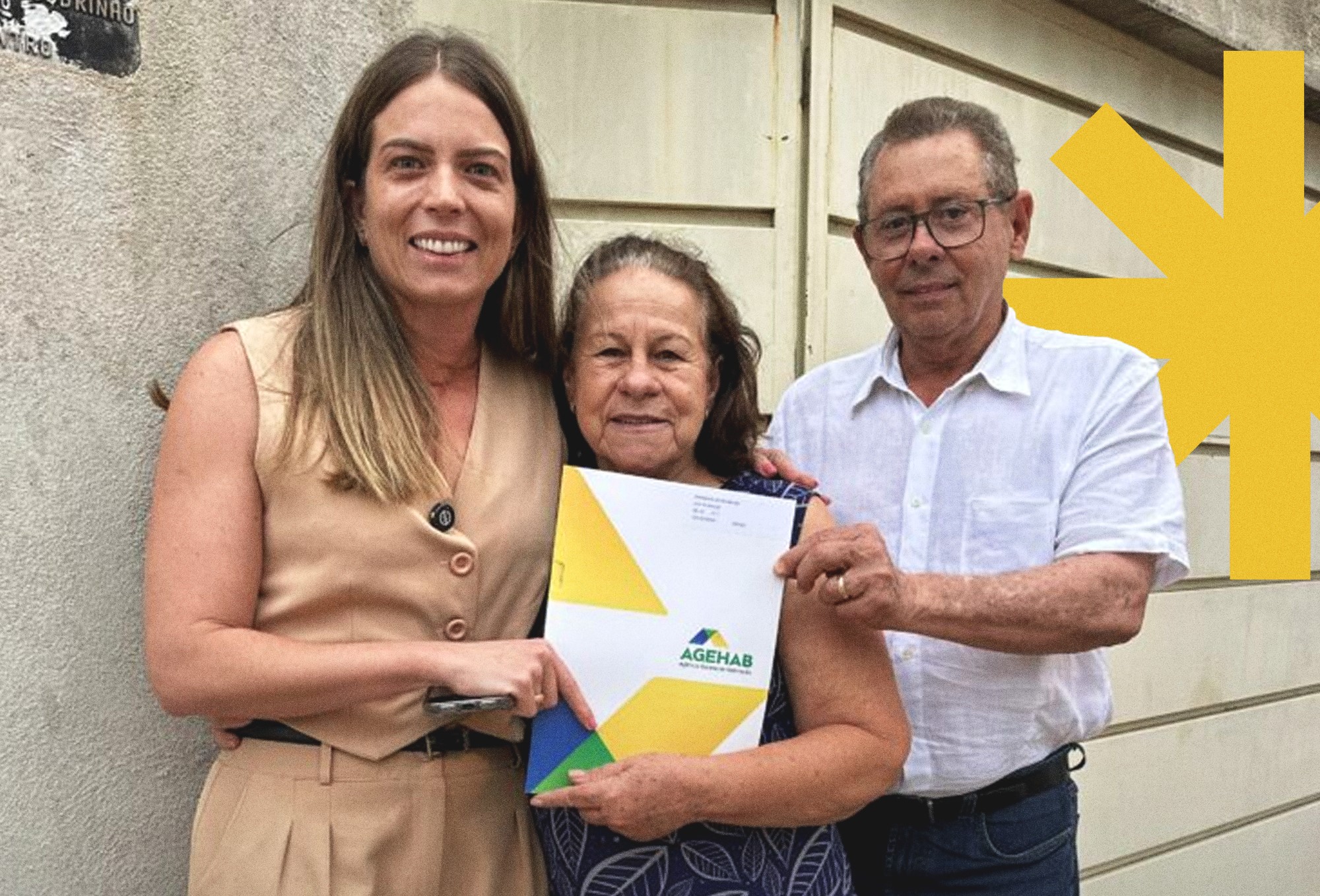 Secretária municipal de Habitação, Camilla Donegá, e prefeito Machadinho com beneficiária do programa de regularização fundiária. Todo trabalho em busca de segurança jurídica e mais moradia é sinônimo de conquistas aos que realmente necessitam – Fotos/imagens, inclusive da home: Secom/Prefeitura