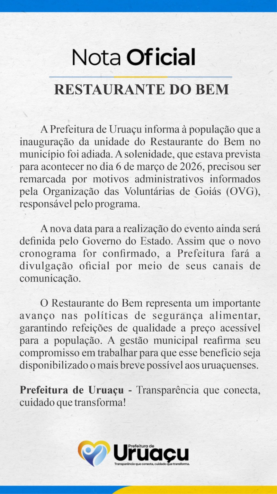 Organização das Voluntárias de Goiás e Prefeitura de Uruaçu adiam evento de inauguração da unidade do Restaurante do Bem. Nova data será agendada e informada.